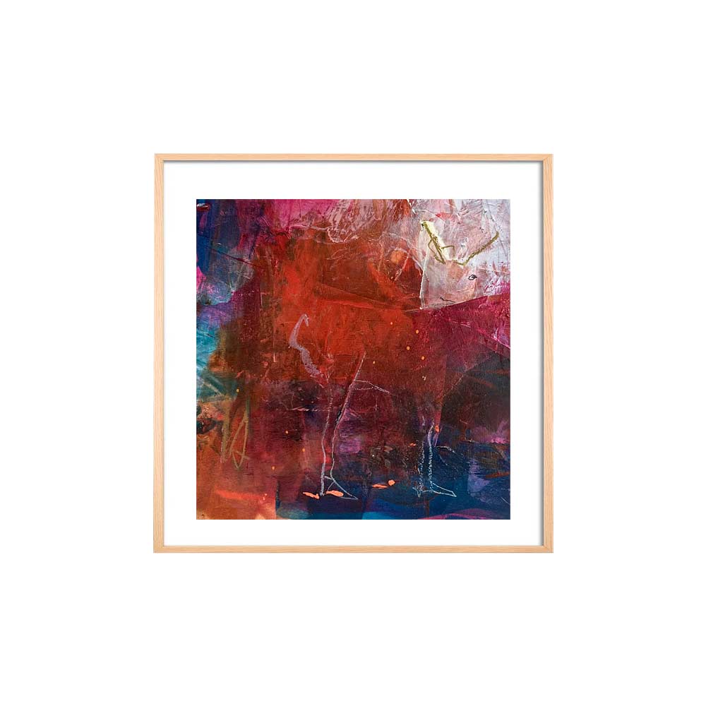Flot egetræsramme med glas medfølger, så værket er lige til at hænge op.