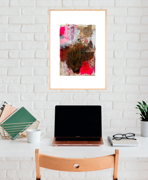 Originalt værk (collage & mixed media). Selve værket er limet op på hvidt syrefrit papir (Hahnemühle papir), så det falmer ikke.